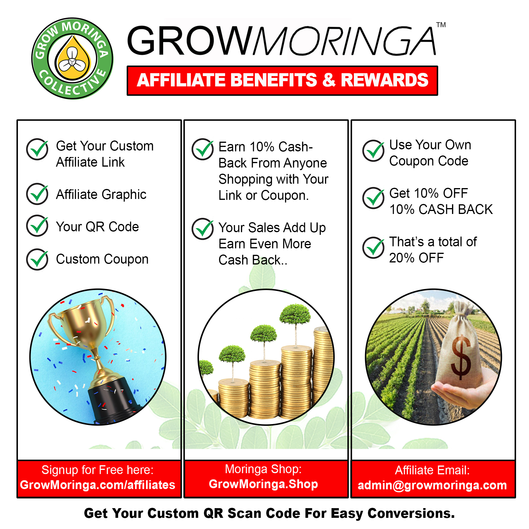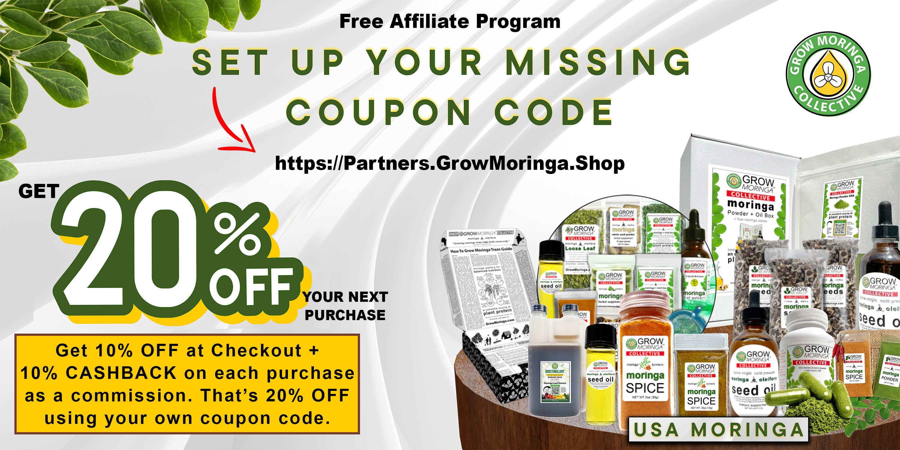 Each time someone clicks your custom affiliate link or uses your coupon code, they'll be taken to the Grow Moringa Shop to purchase moringa products. When they checkout, you'll earn at least 10% Cash Back percentage of their purchase price.