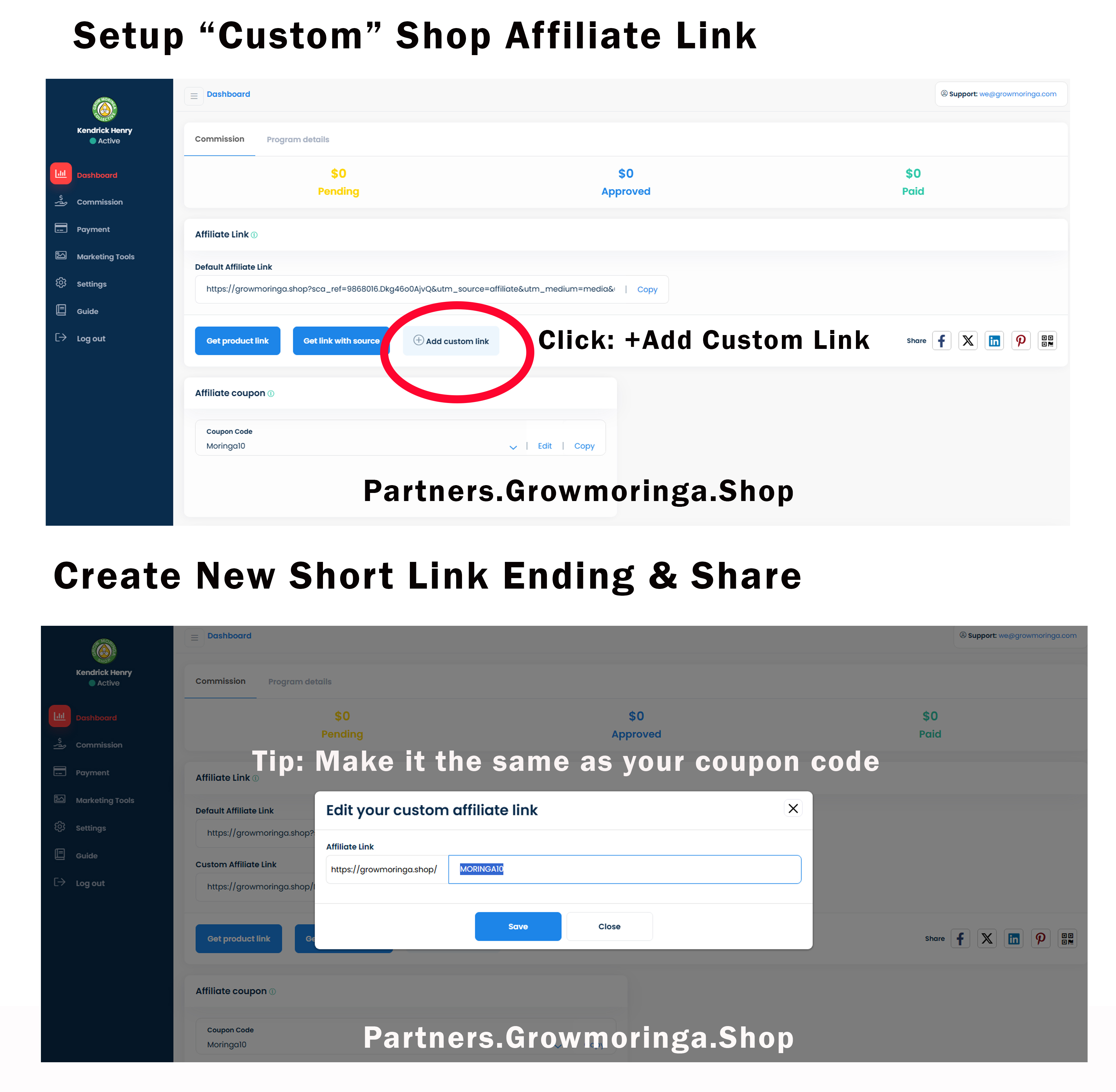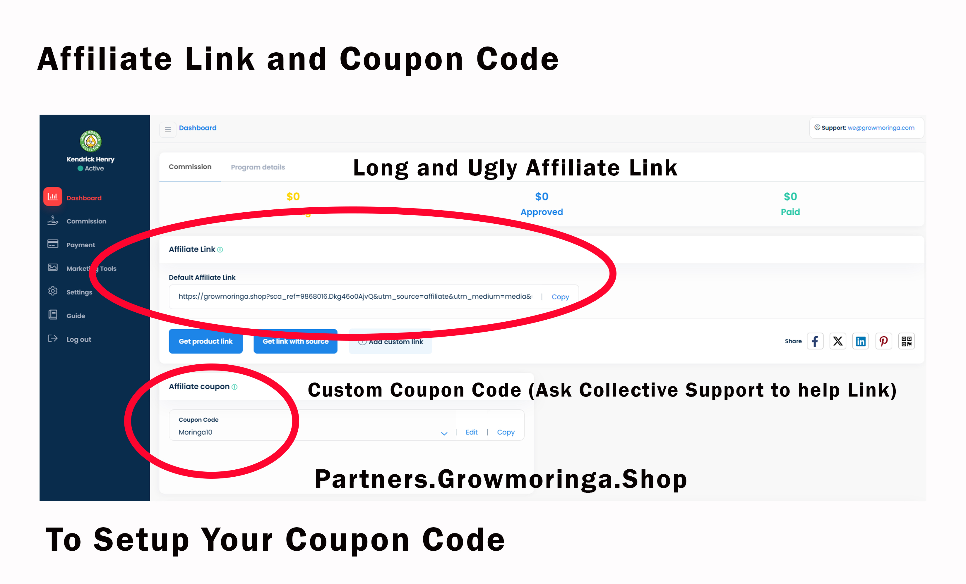 ✅ This is the easiest way to earn commissions By sharing your coupon code, you're giving people 10% off their order. Create a simple, easy to use coupon. The shorter the better. Add the number 10 to the end to symbolize the discount. Make it the name of your moringa business or an acronym like 'LAM10' for Los Angeles Moringa.