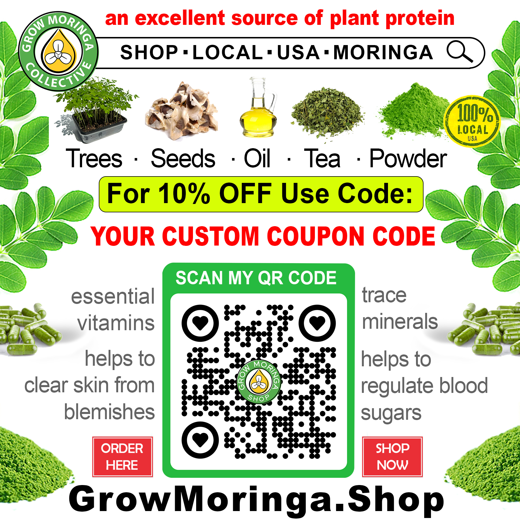 Here's what you text/post: "Shop Local USA Moringa Here. For 10% Off Use code 'MYCODE10' at https://GrowMoringa.shop"