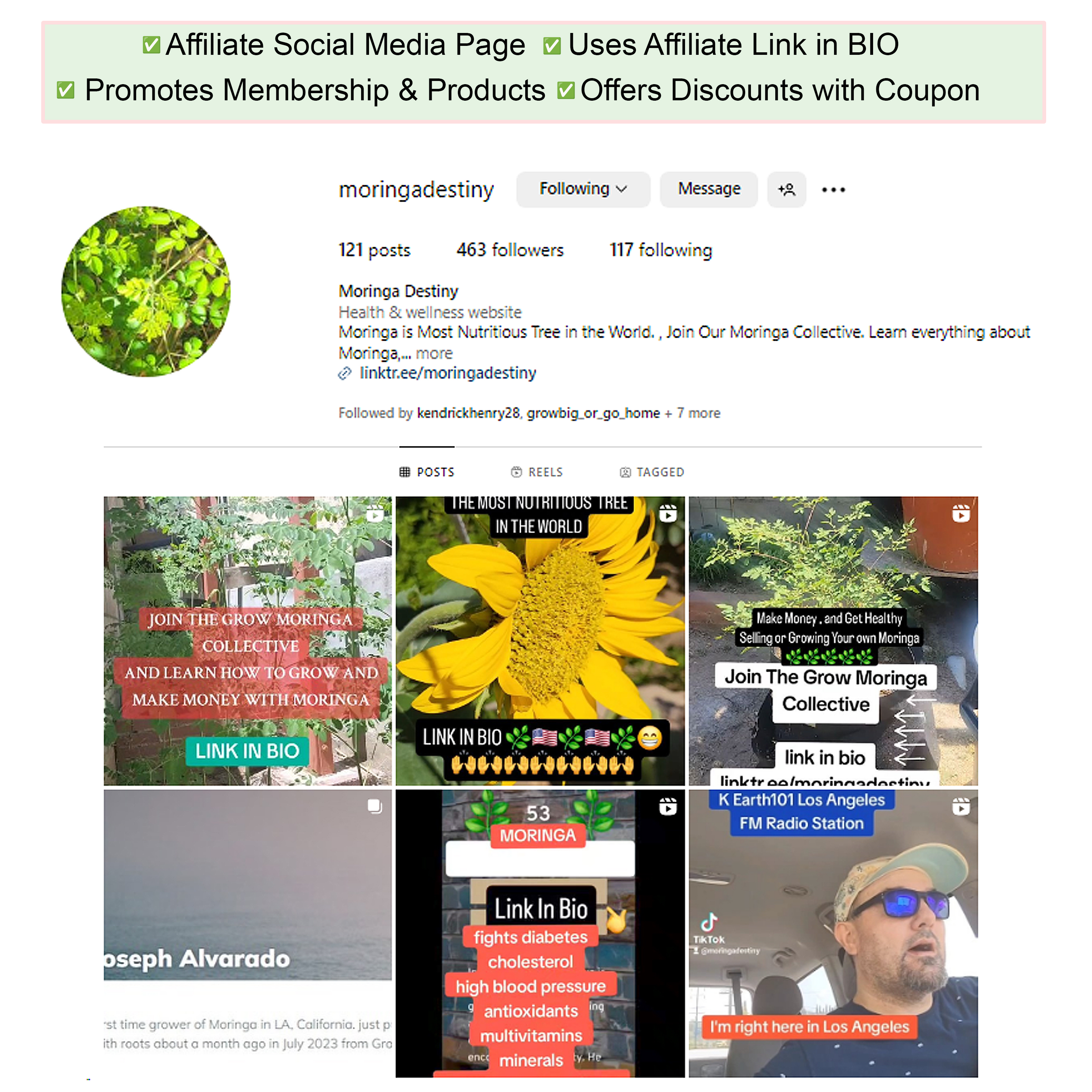 An advanced affiliate creates ads on social media selling moringa for a discount using their coupon code.