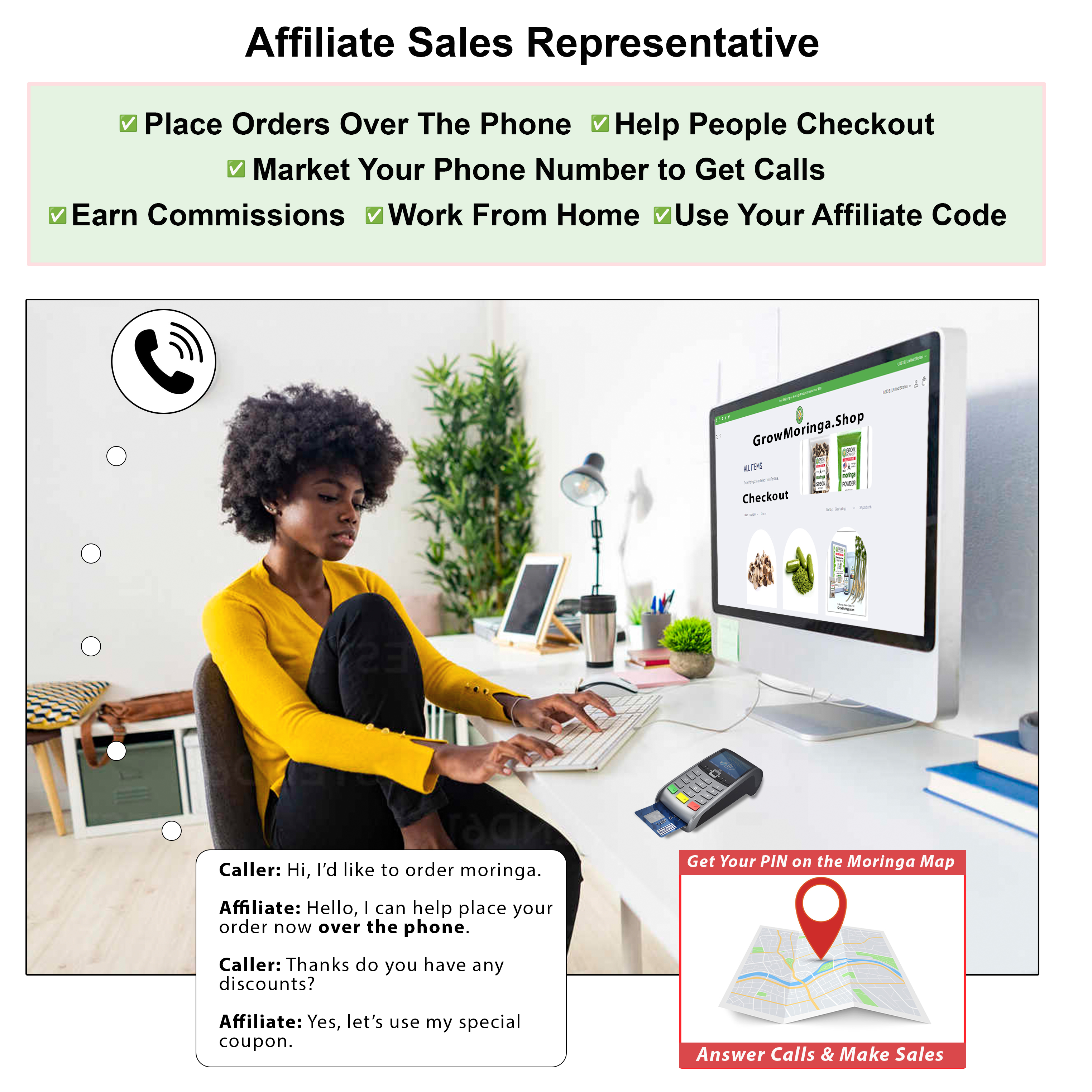 Direct traffic/callers to purchase from you over the phone with ads and a business address. You can even help people to checkout over the phone and place the orders for them using your coupon code on our website. Most people need help ordering things and they find it much easier to call people. Become an independent moringa sales representative and we will fulfill all orders for you.