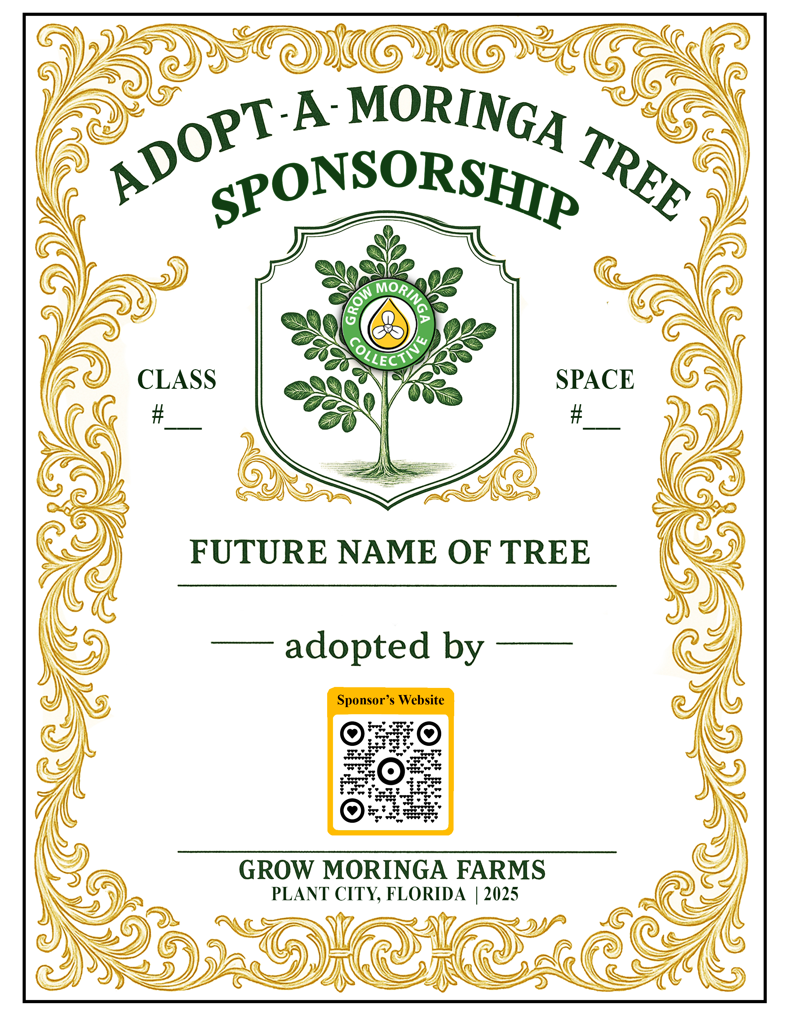 Sponsorship includes your own Adopt-A-Moringa Tree Space. Name your tree and get a sign on location at Grow Moringa Farms. You'll receive a personalized Adopt-a-Tree sign with your name or business at the base of your tree. Name your tree and also get a certificate of sponsorship with a photo of your tree.